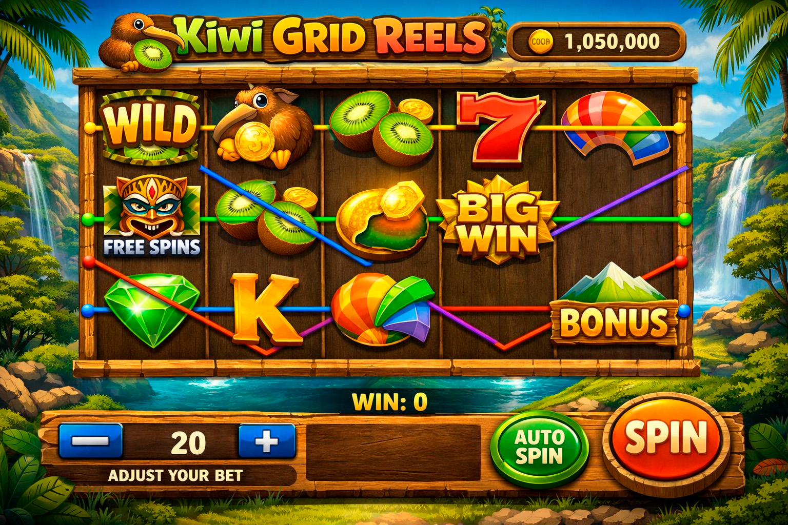 A 3x5 slots-style grid with multi-line payouts, adjustable bets, and auto-spin streak rewards.